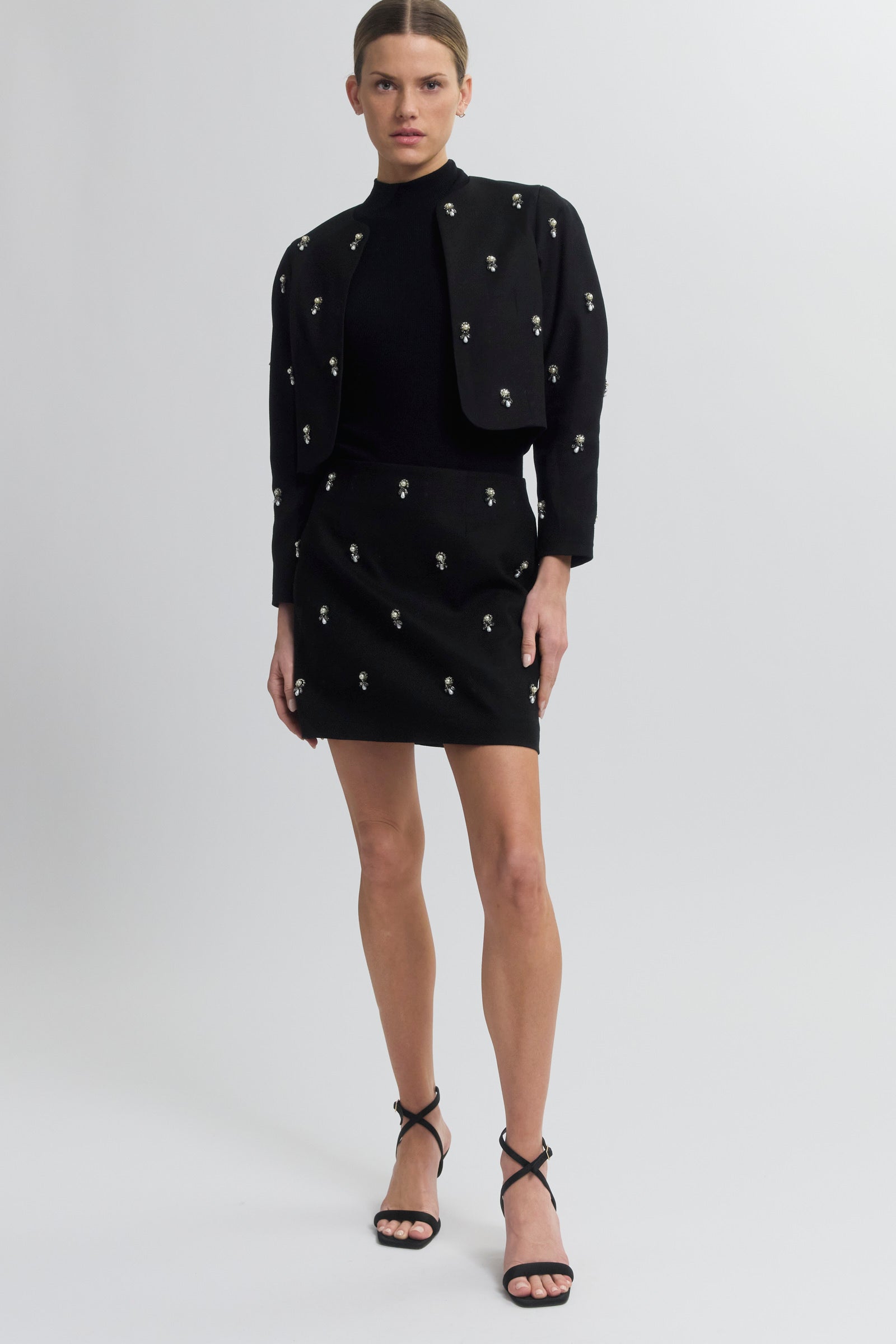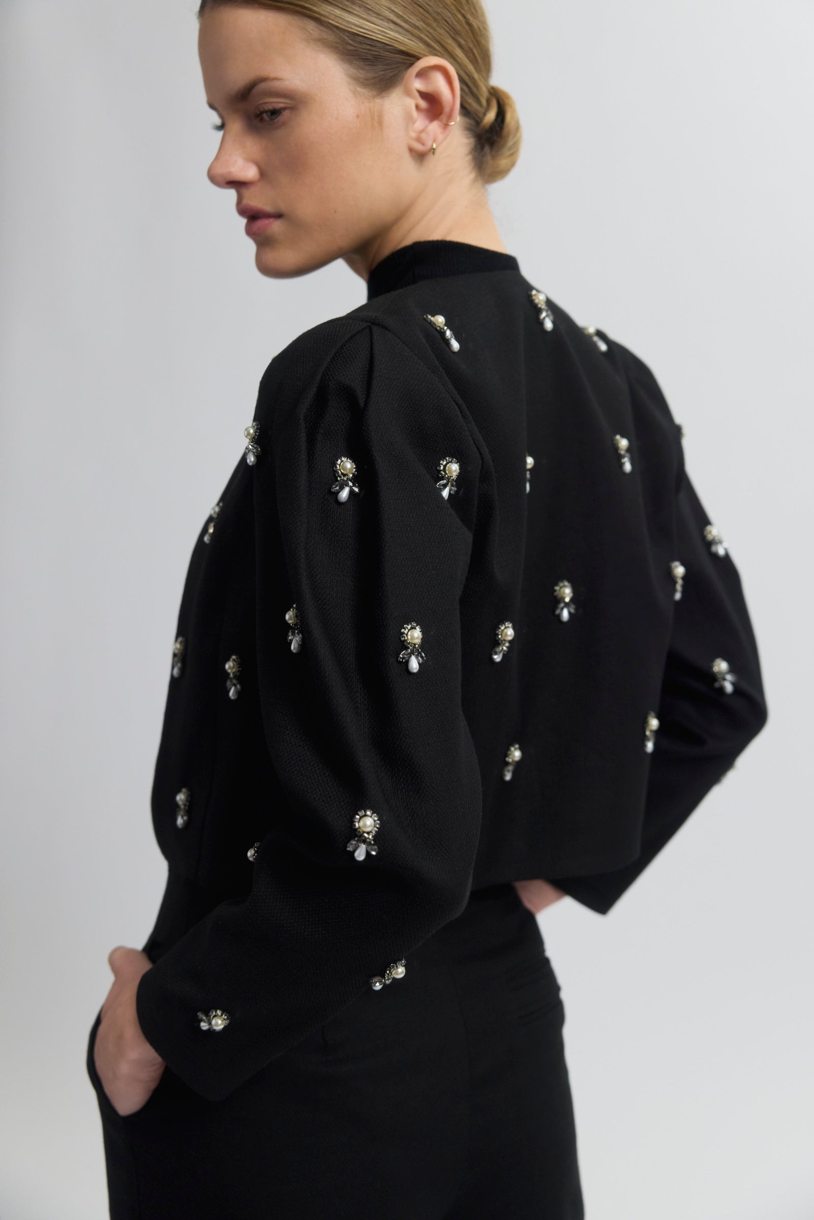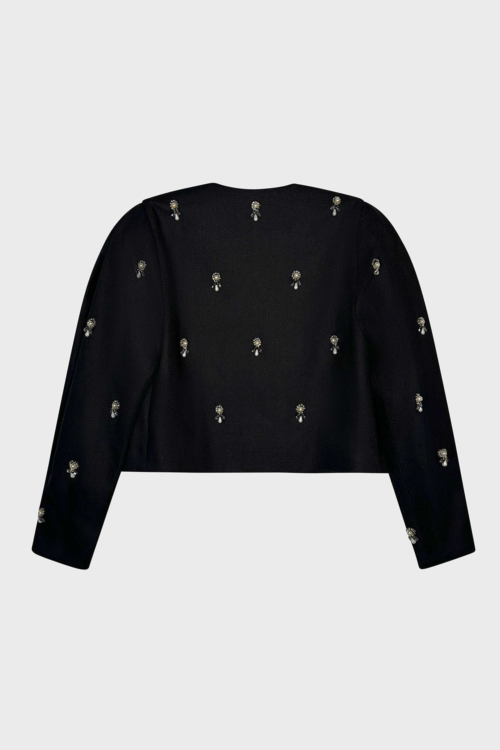 ARIAS prides itself on producing high-quality pieces made in New York, offering one-of-a-kind pieces you will not find elsewhere. The Pearl-Beaded Cropped Jacket is hand embroidered with an intricate pearl and crystal applique rendered in a luxe textured suiting blend. It has a flattering, close-to-the-body fit with artful pleating at the shoulders and a 3/4 bracelet sleeve.