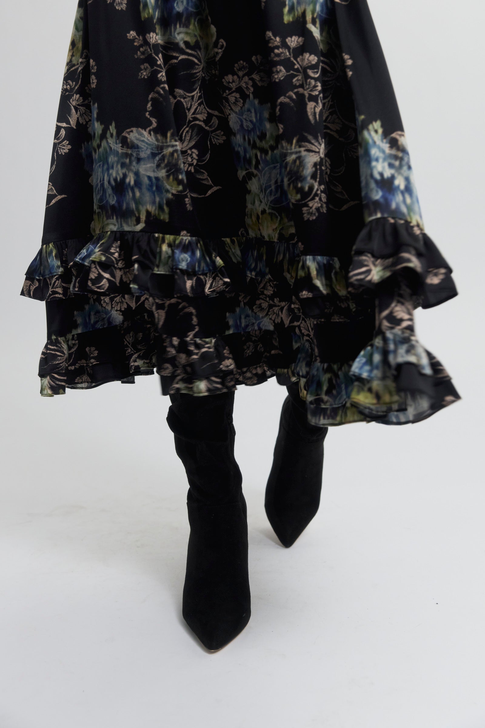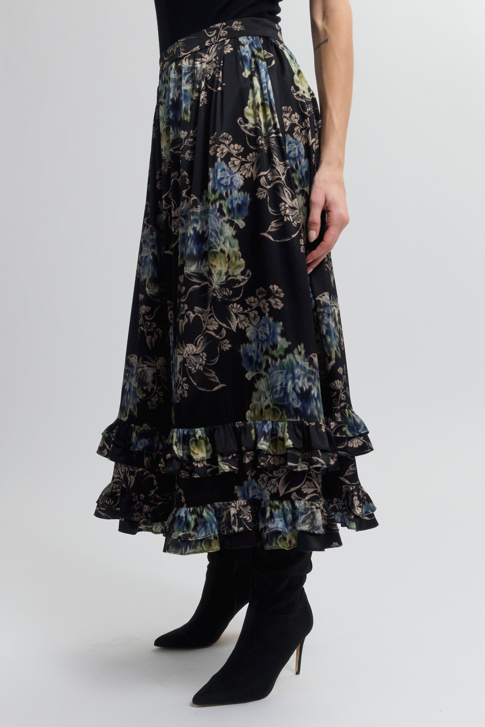 ARIAS New York's collections are inspired by contemporary art and designed to take you from day to night. The Ruffle Midi Skirt is rendered in an artsy floral print in silk charmeuse, features ruffles at the hem, and a flattering fit and flare shape.