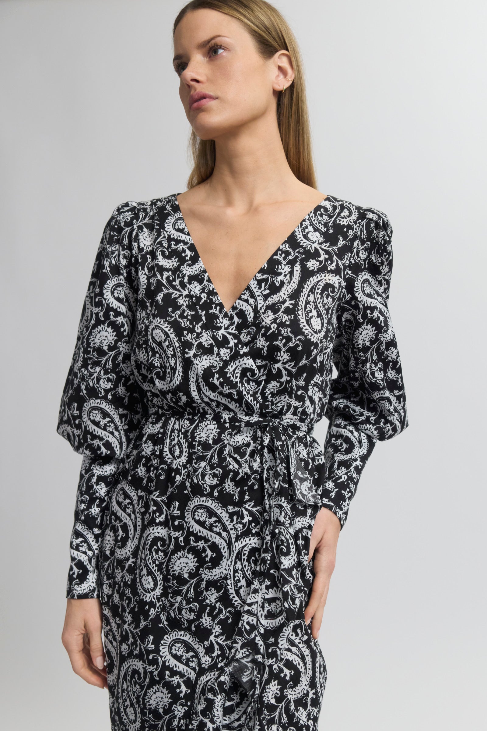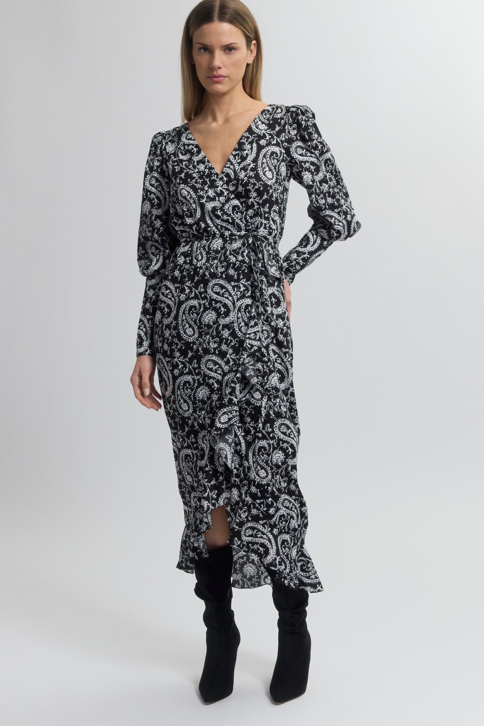 Capturing a cool downtown spirit with sophisticated yet approachable styles, the ARIAS New York brand has become synonymous with modern elegance and what women want to wear. The V-Neck Wrap Dress with Ruffle is rendered in luxe cotton sateen in an artful paisley floral print and features a curved hem with ruffle details.