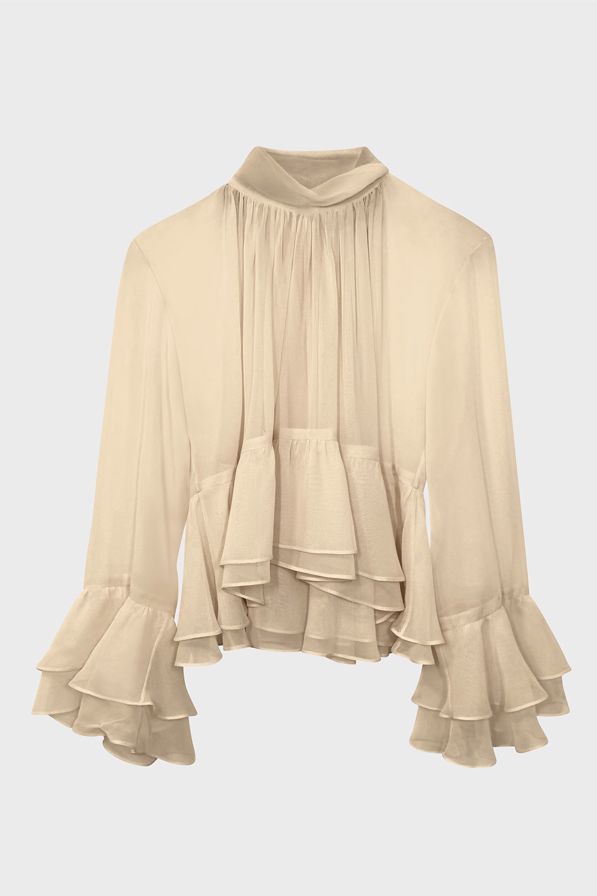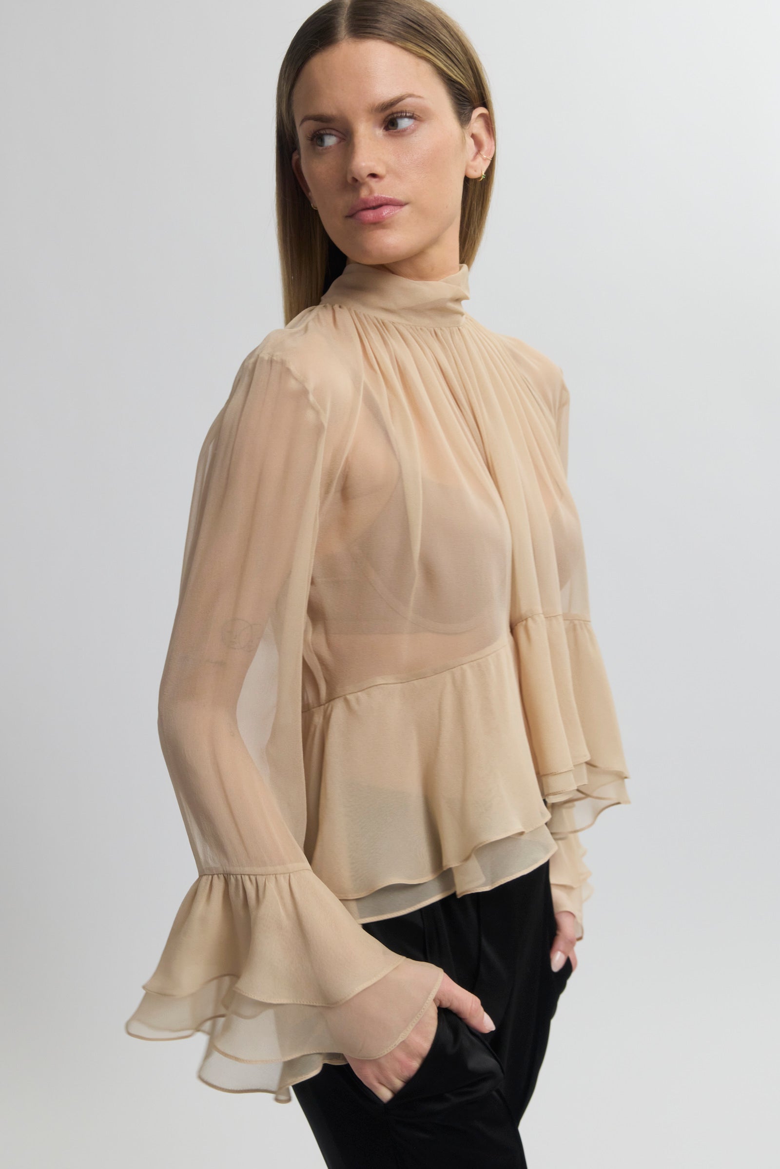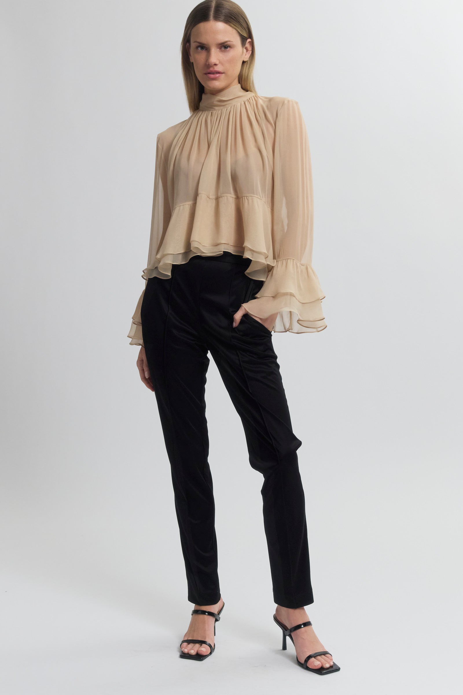 ARIAS New York is a quiet luxury insider's secret. The Gathered Neck Ruffle Top is crafted from luxe silk chiffon, featuring an artfully gathered neckline and ruffled sleeves. Style with our Signature Tuxedo Pants or your favorite pair of jeans to complete the feminine look.