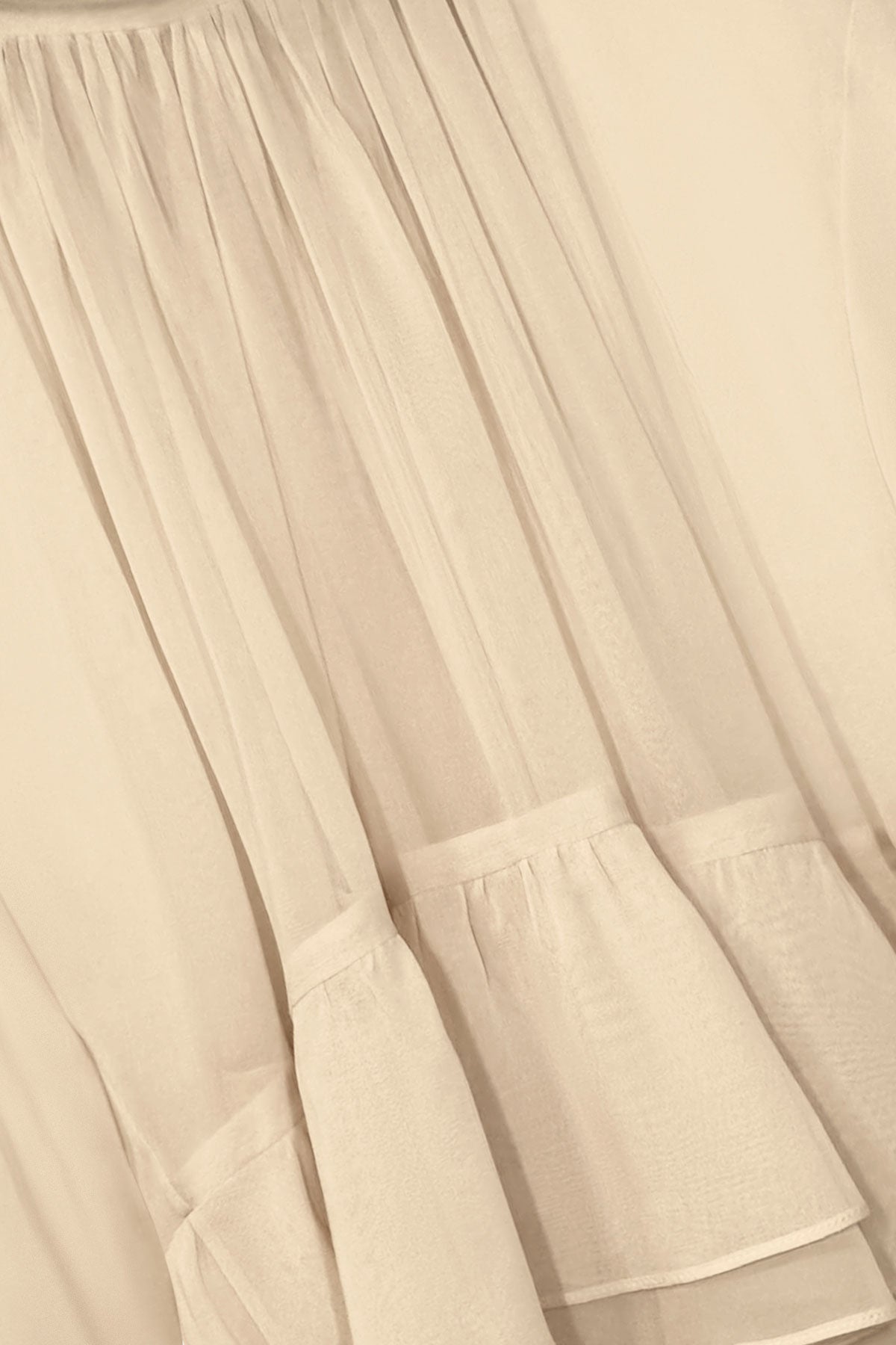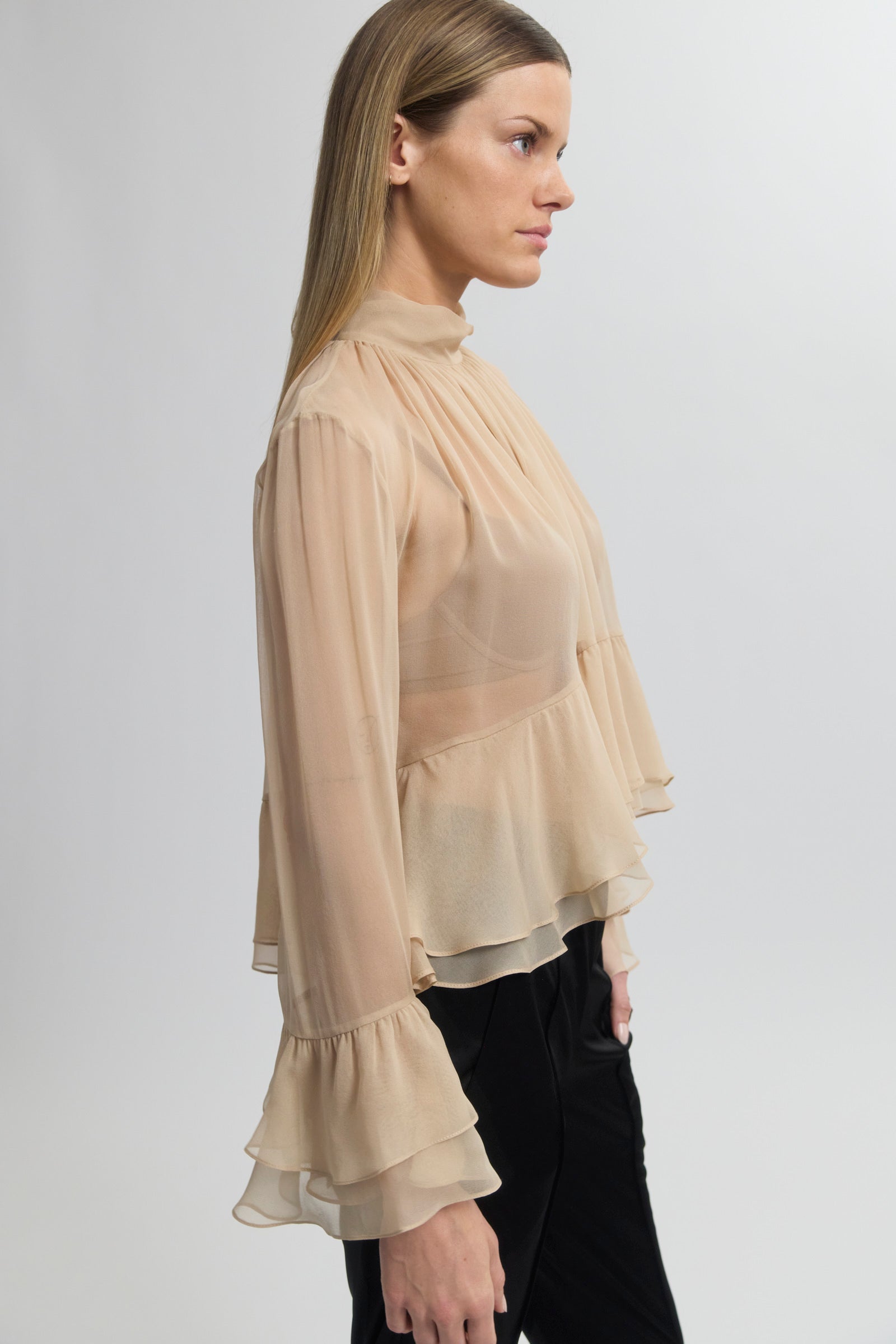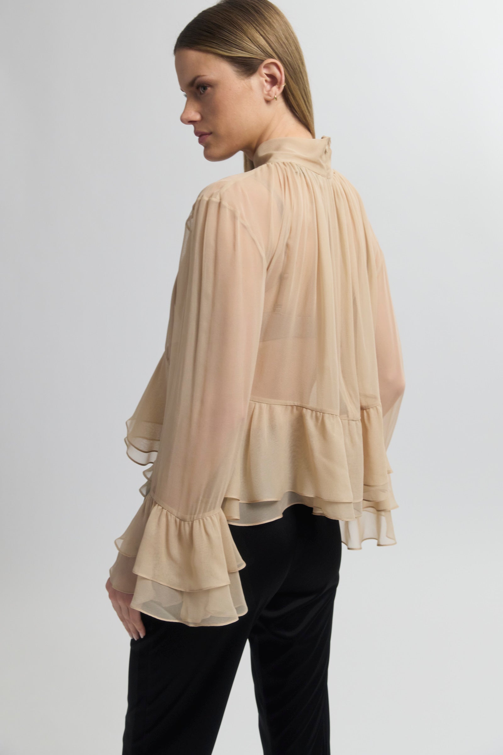 ARIAS New York is a quiet luxury insider's secret. The Gathered Neck Ruffle Top is crafted from luxe silk chiffon, featuring an artfully gathered neckline and ruffled sleeves. Style with our Signature Tuxedo Pants or your favorite pair of jeans to complete the feminine look.