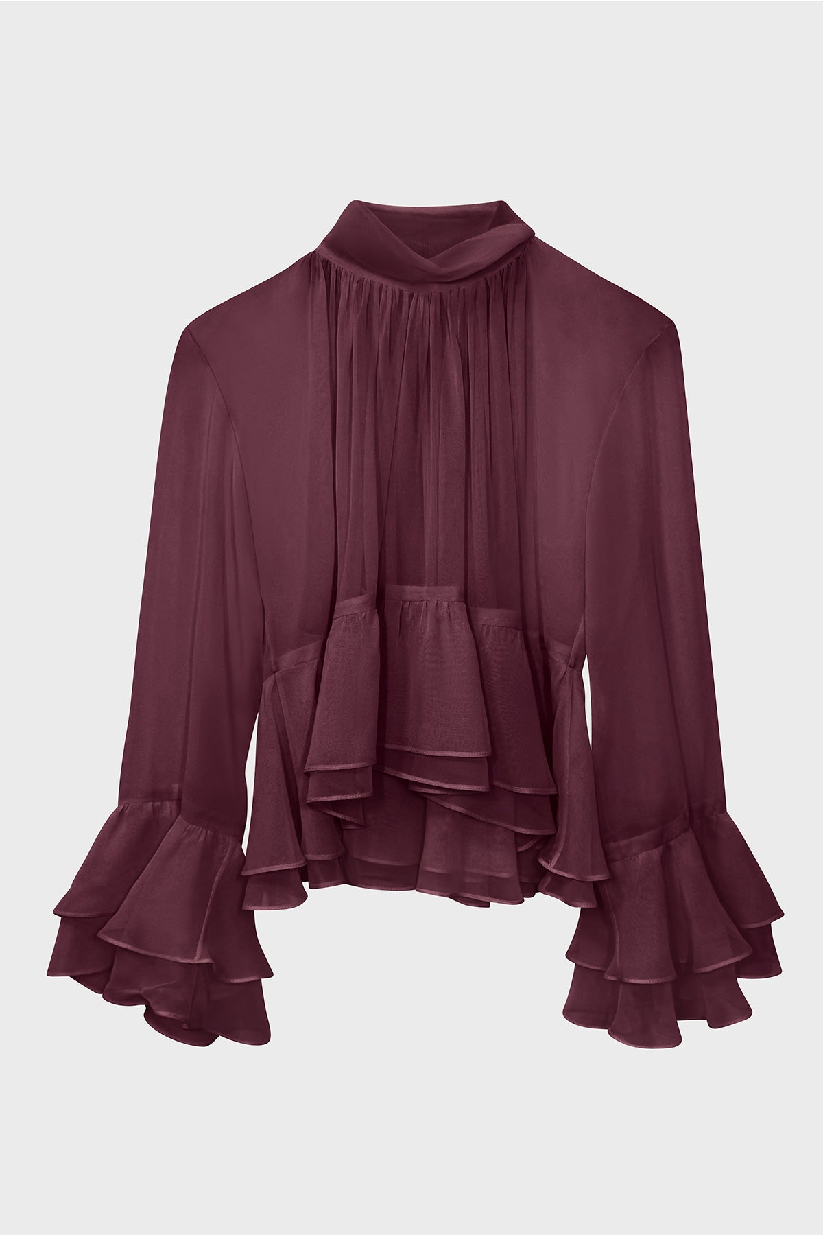 ARIAS New York's collections are inspired by contemporary art and designed to take you from day to night. The Gathered Ruffle Neck Top is rendered in a luxe silk chiffon, featuring an artfully gathered neckline and ruffle sleeves—style with our Signature Tuxedo Pant or your favorite pair of jeans to complete the feminine look.